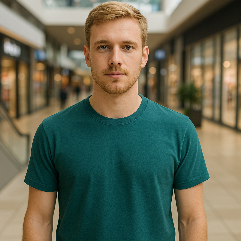 Modelo Rubio en Centro Comercial: Ideas de Outfit con Camiseta Básica para un Look Casual y Moderno